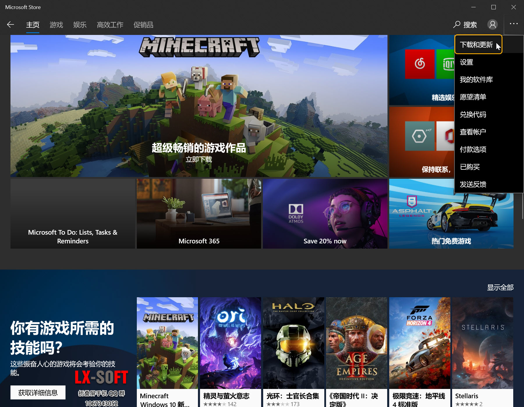 5、从任务栏或开始菜单中打开Microsoft Store,点击右上角的三点,然后选择下载和更新