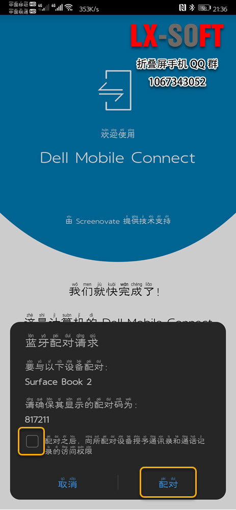 17、手机上会弹出蓝牙请求,为了之后的功能能够正常使用,需要勾选对话框,然后点击配对